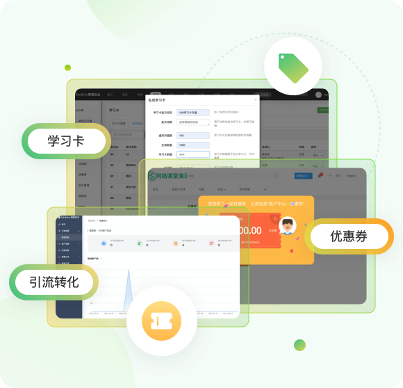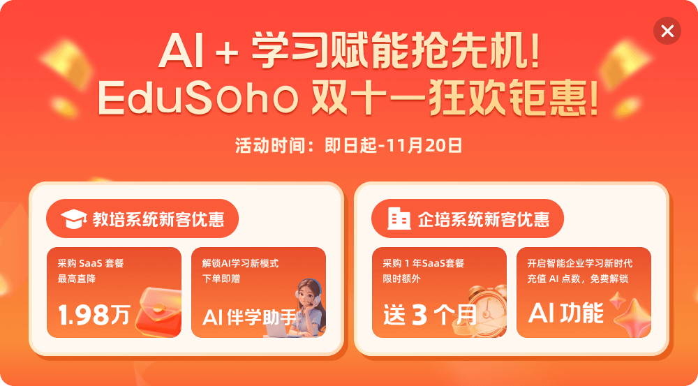 EduSoho 教育云 + AI 基座 拼團、秒殺、兌換碼、學習卡、公開課,多樣化的營銷工具,幫助培訓機構實現全渠道引流及轉化。