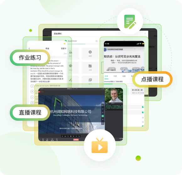 點播、直播、PPT、作業練習、在線討論等12+教學方式,打造“教學測評練管”線上學習閉環。